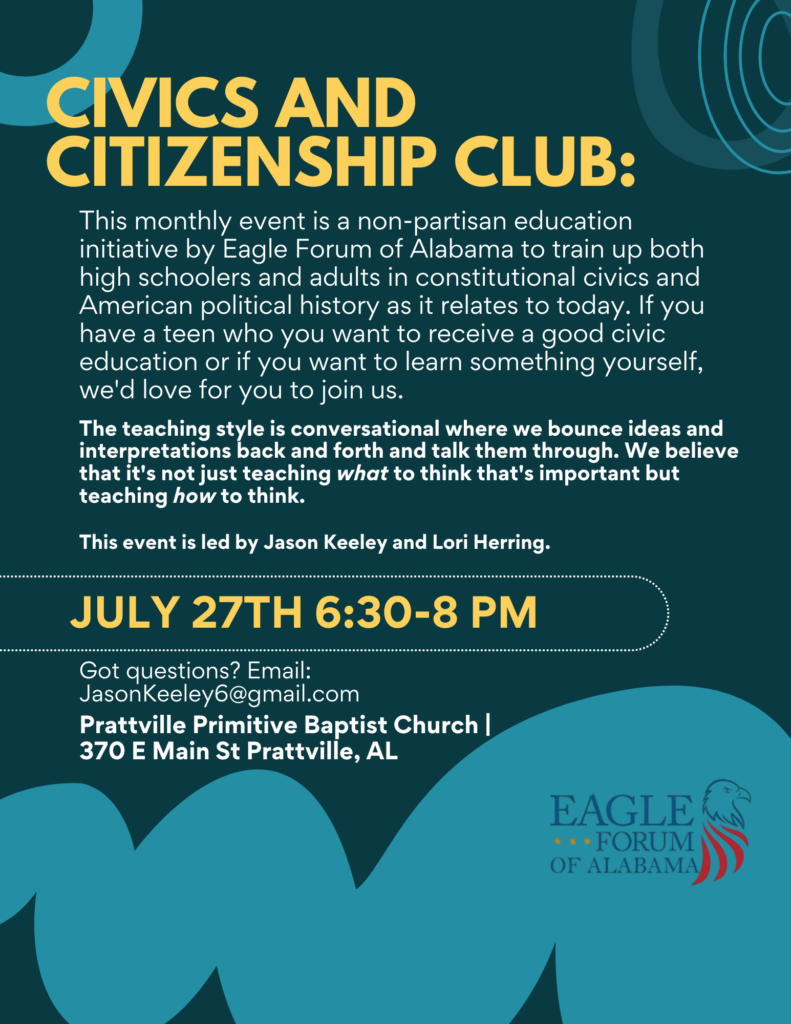 This monthly event (every fourth Monday) is a non-partisan education initiative by Eagle Forum of Alabama to train up both high schoolers and adults in constitutional civics and American political history as it relates to today. If you have a teen who you want to receive a good civic education or if you want to learn something yourself, we’d love for you to join us.