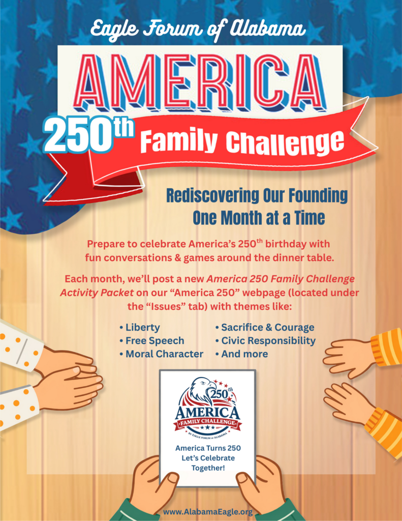 As this legislative session and an entire era comes to a close in Alabama, we are living in an exciting season for our beloved country. As we celebrate America’s 250th Birthday through our free monthly Family Challenge series, our mission remains strengthening families, preserving the principles that made America great and engaging families in our nation’s founding.