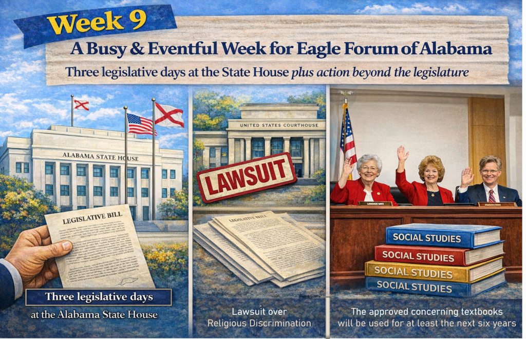Week 9 was an especially busy and eventful week for Eagle Forum of Alabama. (To underscore that, view the news hits at the bottom of this post.) In addition to three legislative days at the State House, we took action on several fronts beyond the legislature. One Tuesday, we filed a federal lawsuit against the Tuscaloosa Public Library over unconstitutional religious discrimination, and on Thursday we testified before the Alabama State Board of Education regarding serious concerns about bias in the proposed social studies textbooks. Unfortunately, despite these concerns, the board voted to adopt the new textbooks, meaning they will likely remain in use in Alabama classrooms for at least the next six years.